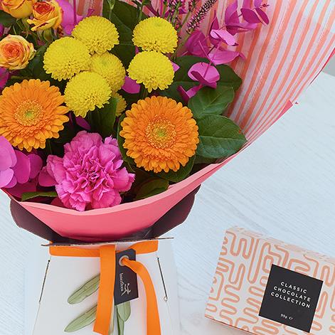 An elegant gift box bursting with summer colour, plus scrumptious chocolates and a full sized card.